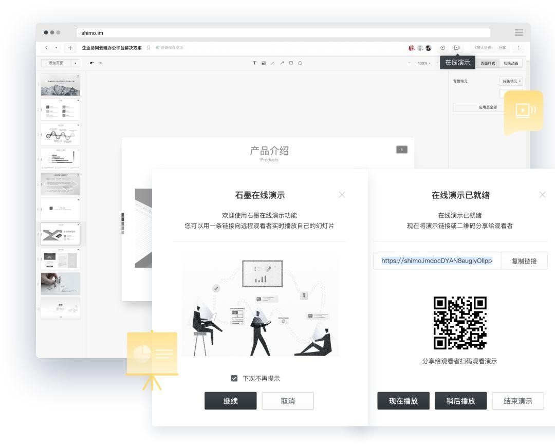 石墨還提供支持多人協作的幻燈片,團隊成員可通過二維碼、鏈接分享給觀眾,無論身在何方,演示時觀眾只需打開電腦、手機、Pad 等設備就能實時同步播放,即使遠隔萬里也如同在一個會議室面對面交流。