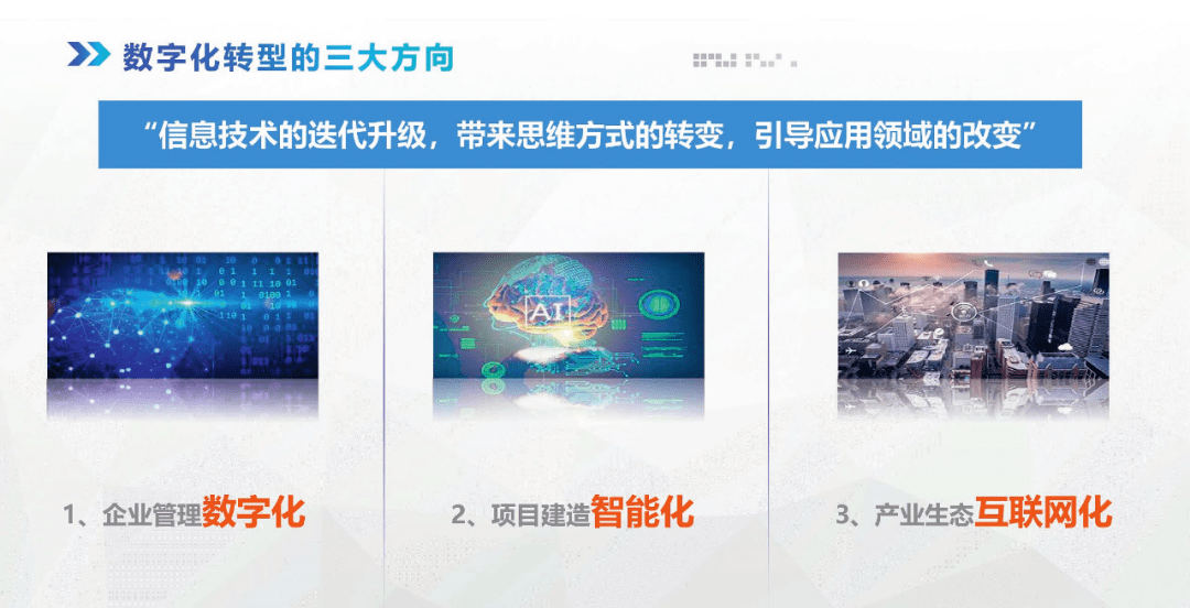 二是項(xiàng)目建造智能化,也就是在項(xiàng)目的建造過程中運(yùn)用數(shù)字化技術(shù),提高人、材、機(jī)的運(yùn)轉(zhuǎn)效率,縮短建設(shè)工期,降低建造成本,提高工程質(zhì)量,減少安全事故,不斷提高項(xiàng)目建造的智能化水平;