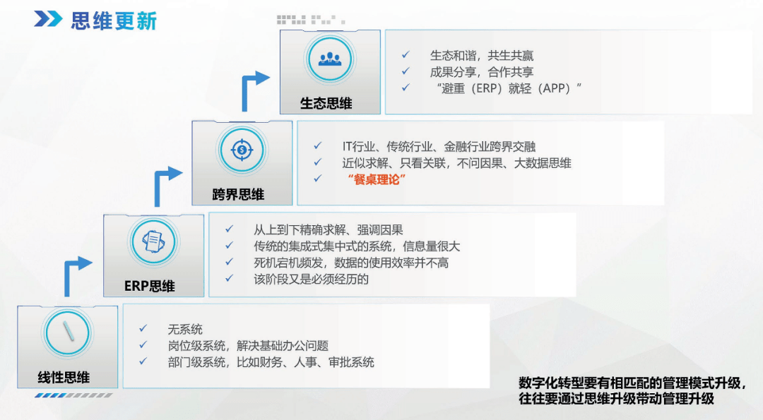 思維模式可以分為線性思維、ERP思維、跨界思維和生態(tài)思維。不同的思維方式會(huì)影響企業(yè)數(shù)字化的進(jìn)程(圖6)。